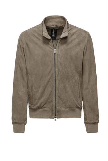 Bomber in pelle scamosciata FrizIl bomber in pelle Friz è un modello iconico caratterizzato dal collo alto chiuso da due bottoni. Per la primavera, Bomboogie lo propone in versione scamosciata.