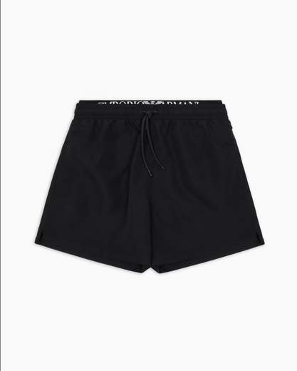 Costume modello shorts con coulisse e inserto elastico in vita con logo frontale a lavorazione jacquard. Il tessuto è realizzato con poliestere riciclato certificato, a sostegno di una produzione circolare e a ridotto impatto ambientale.
