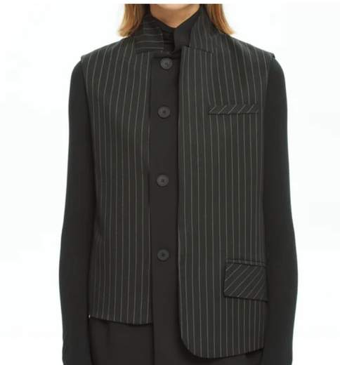 Gilet Sartoriale DestrutturatoGilet dalla costruzione sartoriale MLO, reinterpretato in chiave contemporanea con dettagli destrutturati e silhouette geometrica. Realizzato in un tessuto fluido con righe gessate, unisce l'eleganza del tailoring maschile alla sperimentazione del design femminile.