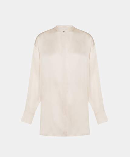 Camicia in pura seta lavata, dal volume morbido con spacchi laterali, caratterizzata da colletto alla coreana dettagliato da multi impunture e abbottonatura nascosta. Manica lunga con polso fessino a uomo chiuso con bottone e piegoline.