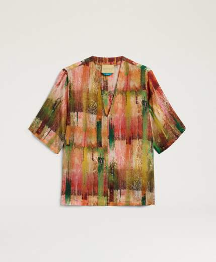 BLUSA ORGAN IN HABUTAI STAMPATO - MULTICOLOR VERDEBlusa a maniche corte in prezioso habutai di pura seta stampata in Italia. La blusa Organ ha un look contemporaneo e disinvolto grazie alla manica lunga fino al gomito ed all’affilato scollo a V. Lo spacco al centro davanti permette di indossare Organ anche in parte dentro i pantaloni per uno styling unico.
