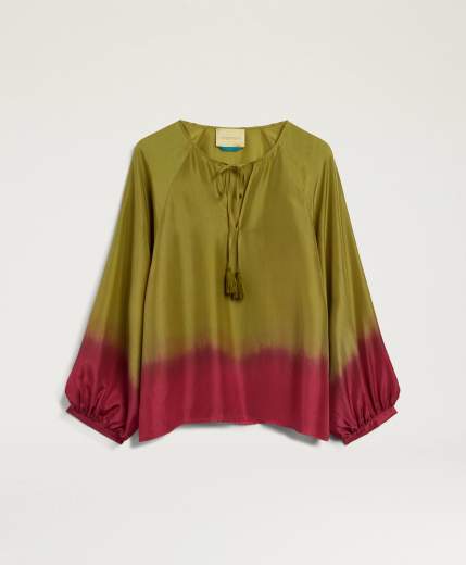 BLUSA MANTRA IN HABUTAI TIE&DYE - OLIO/CICLAMINOCapi con tintura naturale realizzata manualmente. Maxi blusa con maniche raglan in habutai di seta in tinta tie-dye bicolore realizzata manualmente. L’ampia manica arricciata ed il girocollo a goccia con nastro e nappine in tinta definiscono la linea di Mantra; pezzo irrinunciabile per rendere unico ogni look.