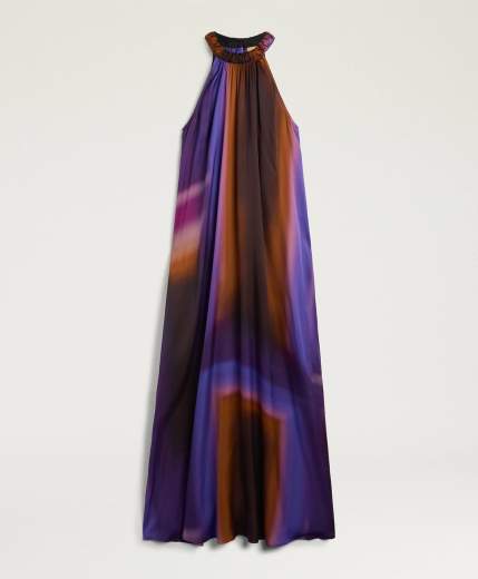 Abito smanicato lungo in in raso di viscosa stampata in Italia nelle iconiche stampe Momonì, con scollo a giro chiuso sul dietro da due bottoncini.