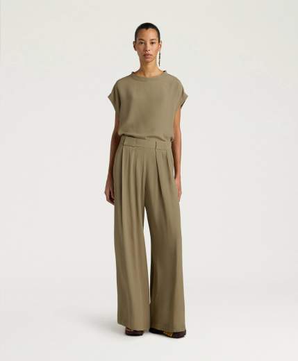 PANTALONI ASPEN IN ACETATO SETA UNITO - VERDE SALVIAPantalone in leggero crèpe di acetato/seta unito carry-over, a palazzo, dalla linea ampia e ariosa. Pieghe frontali bloccate da maxi passanti, tasche inserite nel fianco e cintura elasticata sul retro.