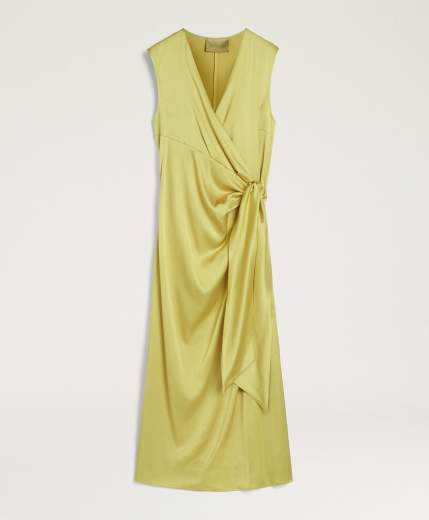 Abito lungo senza maniche in raso di viscosa stretch. La linea drappeggiata con nodo a fusciacca in vita accompagna il profondo scollo a V. Dettaglio è lo spacco laterale a l fondo della gonna a tubo.