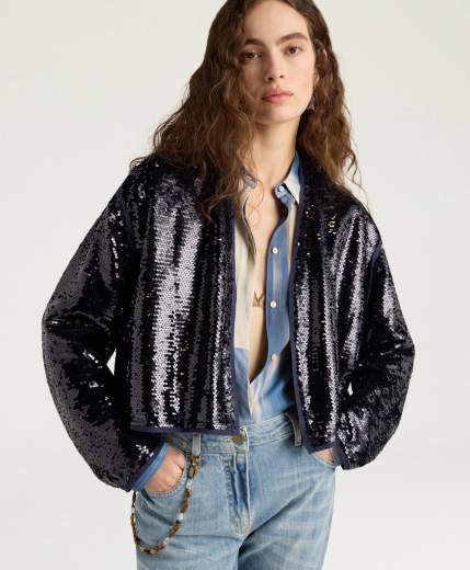 GIACCA PAHOKE IN PAILLETTESSpencer decostruito in paillette. Pahoke, dalla linea boxy con manica scesa, è uno spencer corto rifinito con una raffinata lavorazione a taglio vivo. Capo foderato in twill.