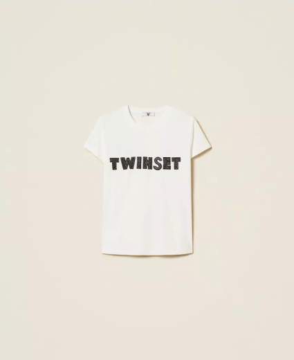 T-shirt con logo patch ricamatoT-shirt in jersey di cotone e viscosa con logo lettering patch ricamato da perline, canottiglie e strass, collo tondo, maniche corte a giro, linea regular.