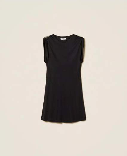 Abito corto con ricamo di paillettesAbito corto in jersey lucido di viscosa con ricamo di paillettes e filo sulle spalle. Ha collo tondo ampio, maniche corte fissate sulle spalle con alamaro, logo a cuore in metallo dorato sul retro, linea morbida.