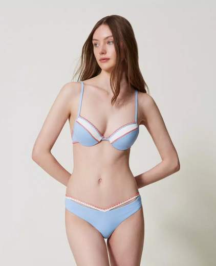 Bikini composto da push-up da bagno e tanga con ricamo a punto bambola, inserto a contrasto e ricamo crochet in trasparenza. Il push-up è imbottito con coppe non estraibili e ha ferretto, laccetti da annodare dietro al collo o da indossare come spalline grazie alle asole presenti alle estremità, chiusura a fiocco sul retro. La brasiliana ha bordature a contrasto, vita a V e logo a cuore in metallo sul retro.