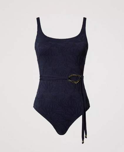Costume intero jacquard con cinturaCostume intero jacquard a motivo foglie e fiori con cintura rimovibile in vita con anello dorato di forma irregolare. Ha spalline larghe regolabili, chiusura sul retro con gancio, ampia scollatura davanti e dietro, il logo a cuore in metallo.