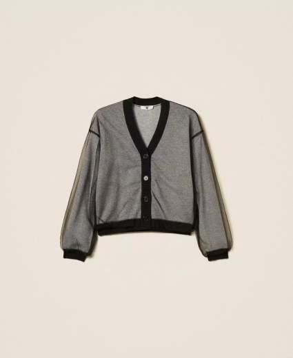 Cardigan in maglia doppiata in tulleCardigan in maglia in maglia di misto lana rasata doppiato in tulle a contrasto. Ha scollatura V, maniche lunghe con spalle scese, profili rifiniti a costine, placchetta logo in metallo sul retro, linea dritta.