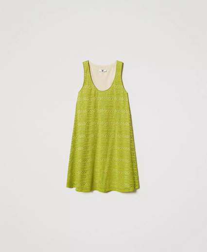 Abito corto in tessuto traforatoAbito corto in tessuto traforato a motivo pizzo geometrico con fodera in colore a contrasto. Senza maniche, ha collo tondo ampio, logo a cuore in metallo sul retro, linea morbida.