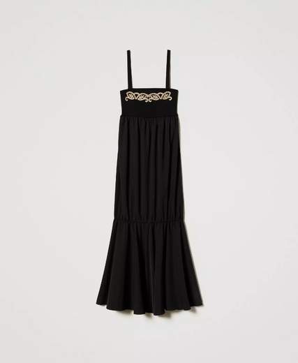Abito lungo in maglia con ricamoAbito lungo con corpetto di maglia di misto cotone ricamato a contrasto, parte inferiore in tessuto con costruzione a balze, spalline sottili, logo a cuore in metallo sul retro, linea morbida.