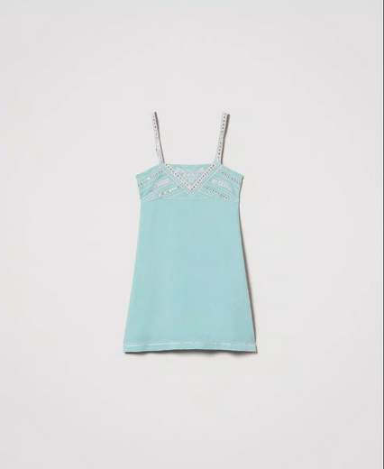 Abito corto in misto lino con ricamoAbito corto in lino e viscosa con ricamo di specchietti, perline e filo. Ha spalline sottili ricamate davanti e regolabili sul retro, taglio a impero, elastico in punto smock sul retro con arricciatura, chiusura con zip e gancetto al fianco, fodera in mussola di cotone, logo a cuore in metallo sul retro, linea fitted e svasata.
