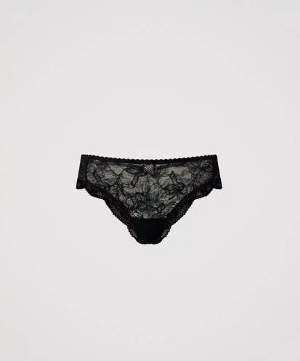 Slip brasiliana in pizzo con profili rifiniti da elastico con smerlo, retro in pizzo smerlato con taglio centrale e logo a cuore in metallo con fiocco in raso e pizzo.