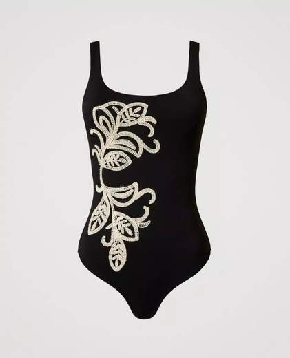 Costume intero con ferretto e ricamoCostume intero con ricamo piazzato Cornely in filo e strass termoadesivi. Senza imbottitura, ha ferretto, spalline ampie regolabili, chiusura con gancio dietro, logo a cuore in metallo sul retro.