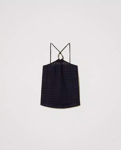 TopTop con lavorazione crochet a disegno conchiglia con scollatura halter ed elemento ad anello irregolare in metallo dorato. Ha elastico interno, spalline in filo intrecciato cucite nello scollo sul retro, logo a cuore in metallo dietro, fodera, linea morbida.